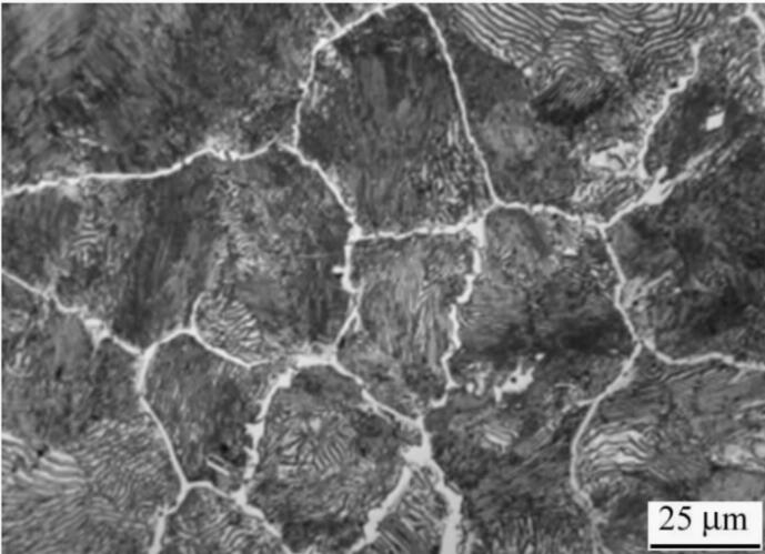 在过共析钢中先共析渗碳体的形态一般呈网状或片状(针状),无块状渗碳体。网状渗碳体通用是冷却速率较慢时形成的,而针状渗碳体(即魏氏组织)是在碳含量大于1.1%和适当冷却速率条件下产生的。先共析铁素体和先共析渗碳体经4%(体积分数)硝酸酒精溶液侵蚀后,光学显微镜下观察都呈白色,不易区分。
